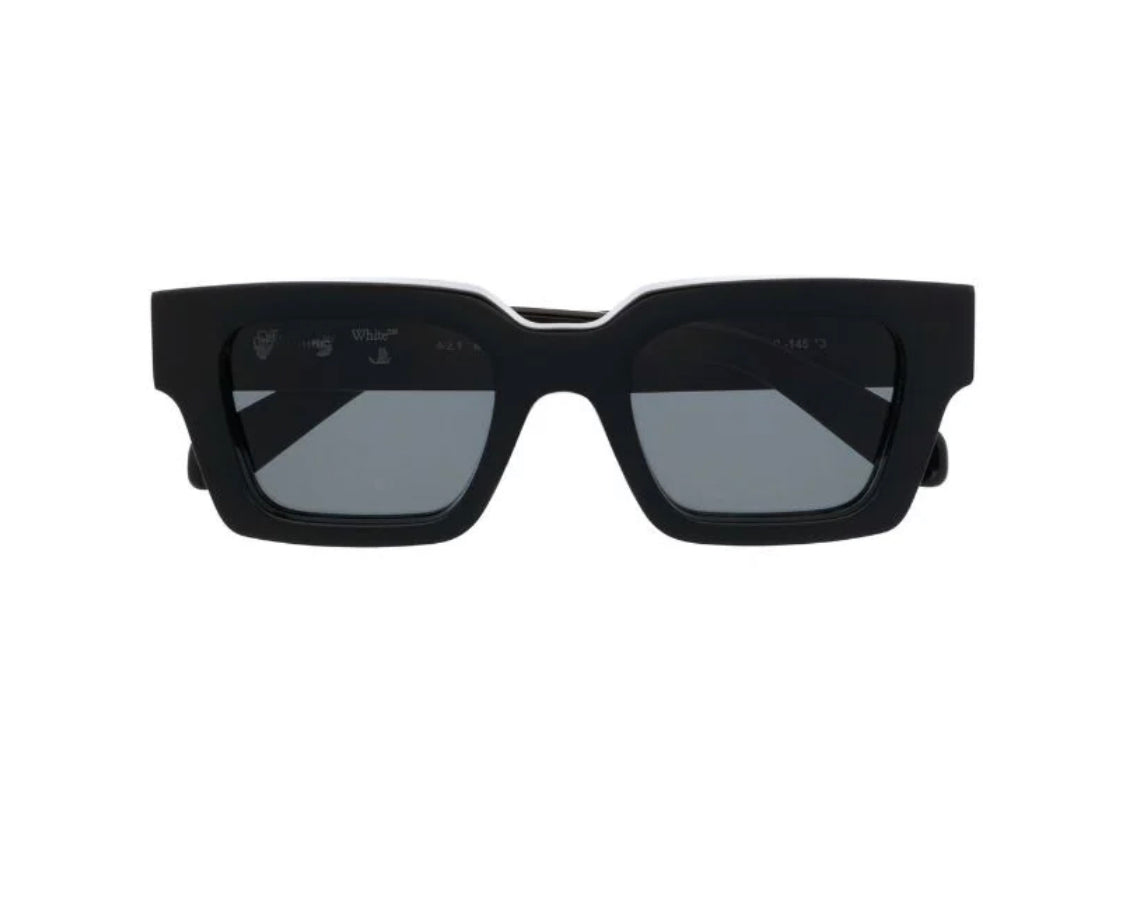 Gli occhiali da sole Virgil di Off-White presentano una montatura rettangolare resa inconfondibile dal motivo bianco Arrows sull'asta, un elemento iconico del brand.